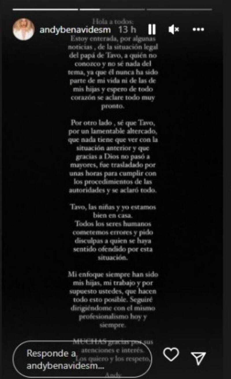 “Hola a todos. Estoy enterada, por algunas noticias, de la situación legal del papá de Tavo, a quien no conozco y no sé nada del tema, ya que él nunca ha sido parte de mi vida ni de la de mis hijas y espero de todo corazón que se aclare todo muy pronto”, comentó Andy en esta publicación sobre el padre de su esposo.