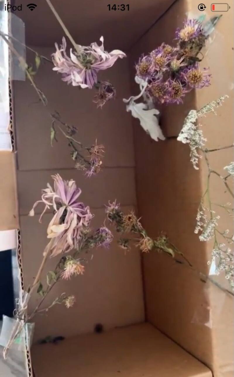 Las flores deben pegarse a los lados muy cuidadosamente para que no se rompan y necesitan sobresalir de la caja, específicamente en el espacio de en medio como si alguien se parara dentro de la caja y viera hacia afuera: lo primero que debe observar son las flores cubriendo algunos espacios.