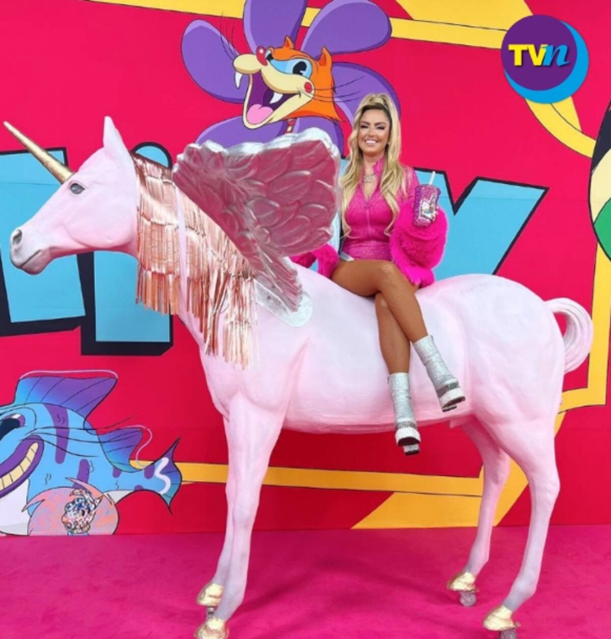 La cantante Karla Díaz fue la encargada de inaugurar la alfombra con una entrada triunfal, como lo describen en redes sociales, pues apareció delante de los espectadores sobre un unicornio gigante color rosa que combinaba con su abrigo de peluche en tono fiusha.
