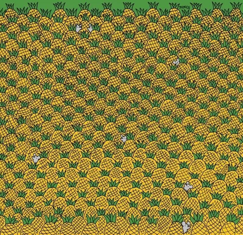 En esta ocasión te presentamos un desafío visual de nivel medio. Se trata de localizar los cuatro elotes que están camuflados entre las decenas de piñas. Debido a la similitud de las formas y del color este reto puede ser complicado para algunas personas, sobre todo cuando se tiene un tiempo establecido para resolver el acertijo. Prepara el cronómetro pues tienes tan solo 10 segundo para lograrlo.
