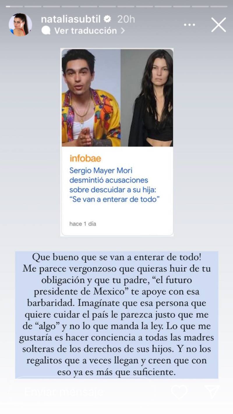 “Después de un año fuera, seis horas de convivencia fueron suficientes. Digo, suficientes para hacer sus videos”, escribió en su cuenta de Twitter Natalia Sutbil, quien no se quedó callada ante la situación que está viviendo con Sergio Mayer Mori, el padre de su hija, y que después de un año volvió a México para convivir con Mila.