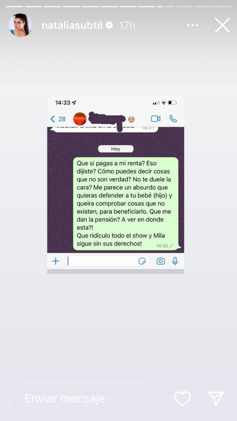 “¿Que sí pagas mi renta? ¿Eso dijiste? ¿Cómo puedes decir cosas que no son de verdad? ¿No te duele la cara?. Me parece absurdo que quieras defender a tu bebé (hijo) y quieras comprobar cosas que no existen para beneficiarlo. ¿Qué me dan la pensión? A ver, ¿En dónde está? ¡Qué ridículo todo el show y Mila sigue sin sus derechos!”, se puede leer en el mensaje que le envió, el cual no tiene respuesta.