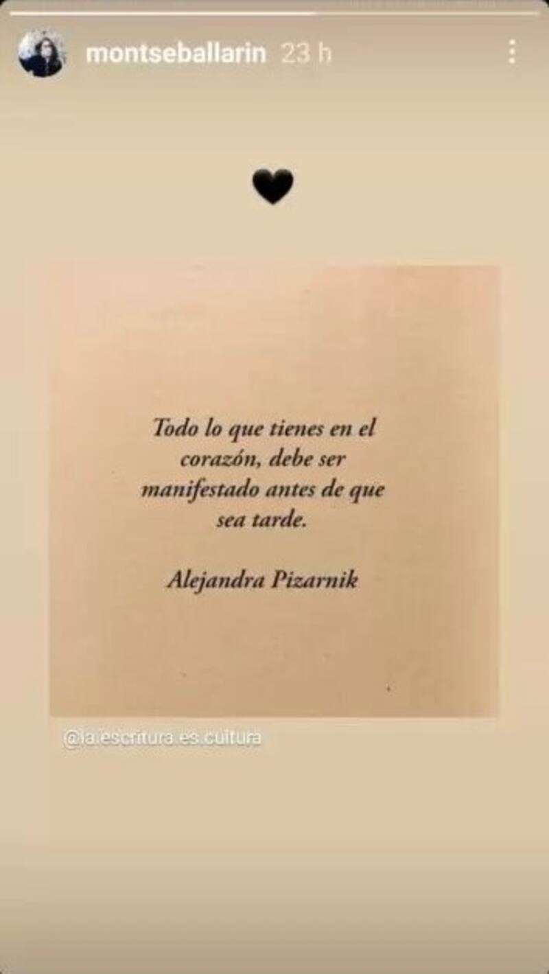 Si bien, ni Montserrat ni Puelles han confirmado la noticia, la actriz compartió en su cuenta de Instagram una historia con una reflexiva cita de la poeta argentina Alejandra Pizarnik. "Todo lo que tienes en el corazón, debe ser manifestado antes de que sea tarde", se lee en el perfil de la intérprete. A pesar de la ruptura, los actores mantienen en sus redes sociales las fotos de sus aventuras juntos.