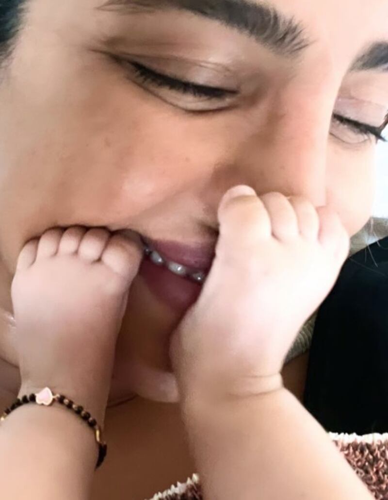 En la primera fotografía, Priyanka Chopra aparece sosteniendo a Malti Marie Chopra Jonas mientras esta se sienta sobre su regazo luciendo un enterito y un cintillo de color blanco. En la segunda, la actriz que ha participado en producciones como Quantico (2015) y Guardianes de la Bahía (2017) posó con los pequeños pies de la niña en su rostro.