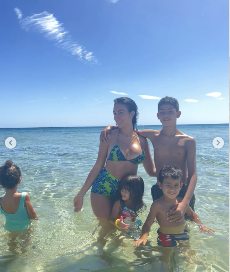 La protagonista del reality show Soy Georgina recientemente publicó una serie de fotografías en la playa. En las instantáneas la modelo lució un bikini verde con motivos flores en color azul y posó al lado de los pequeños: Cristiano Ronaldo Jr. (12), Eva Maria Dos Santos (5), Alana Martina dos Santos Aveiro (4), Mateo Ronaldo (5).