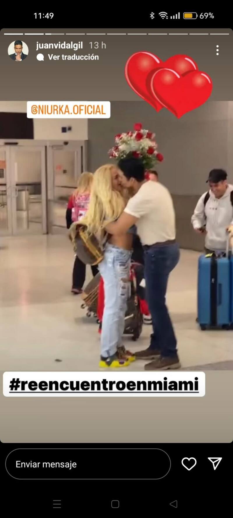 “Volando hasta llegar a ti @juanvidalgil”, escribió Niurka cuando ya se encontraba en el avión y fue posterior a esta publicación cuando anunció que ya estaba en el destino deseado, pero no se esperaba el ramo de rosas rojas con el que Juan ya estaba listo para verla.