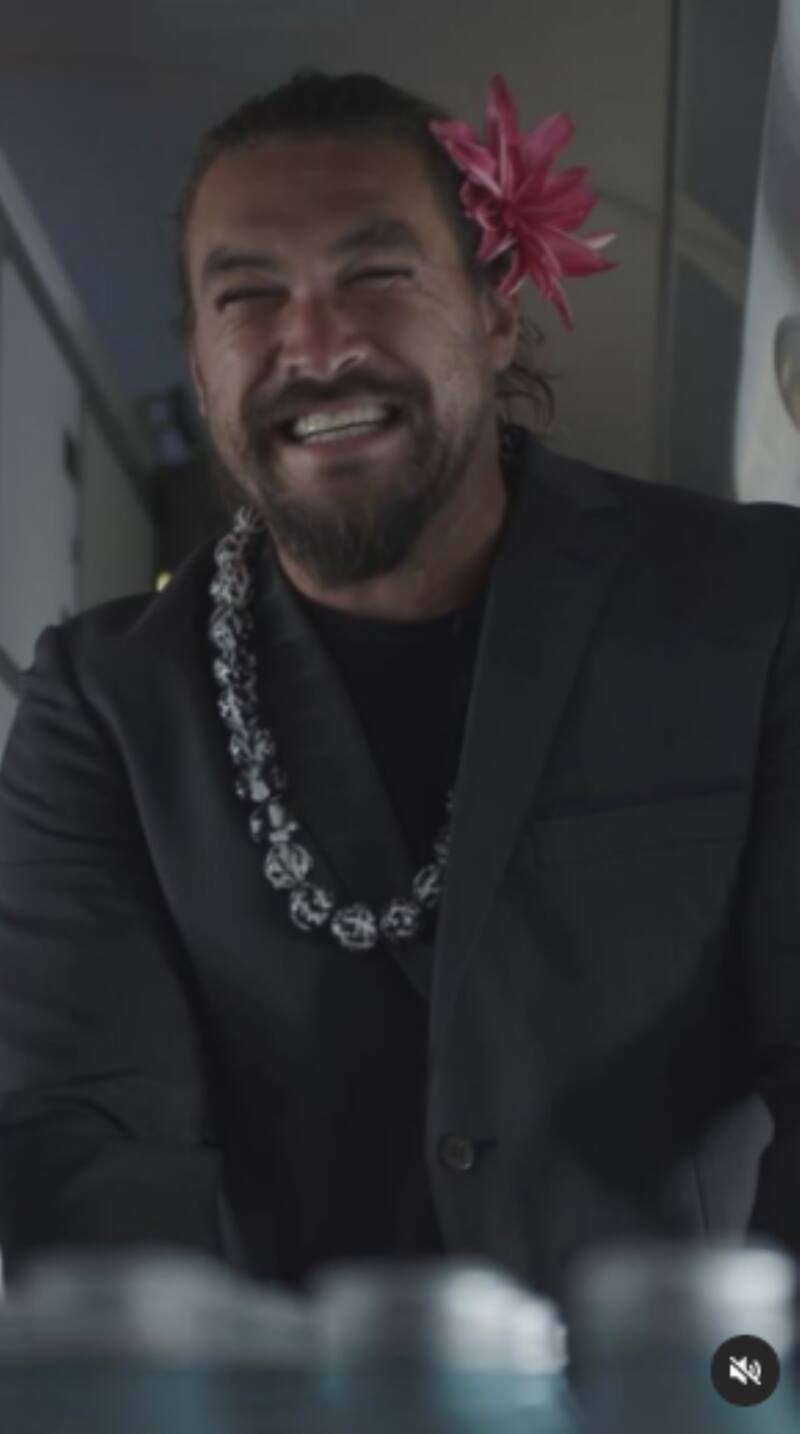 Jason Momoa sorprendió a los pasajeros de un vuelo de Hawaiian Airlines cuando, de repente, se vistió como las azafatas y comenzó a servir bebidas durante el viaje; sin embargo, no se trató de cualquier bebida, pues el actor aprovechó para repartir las botellas de agua de su propia empresa, Mananalu.