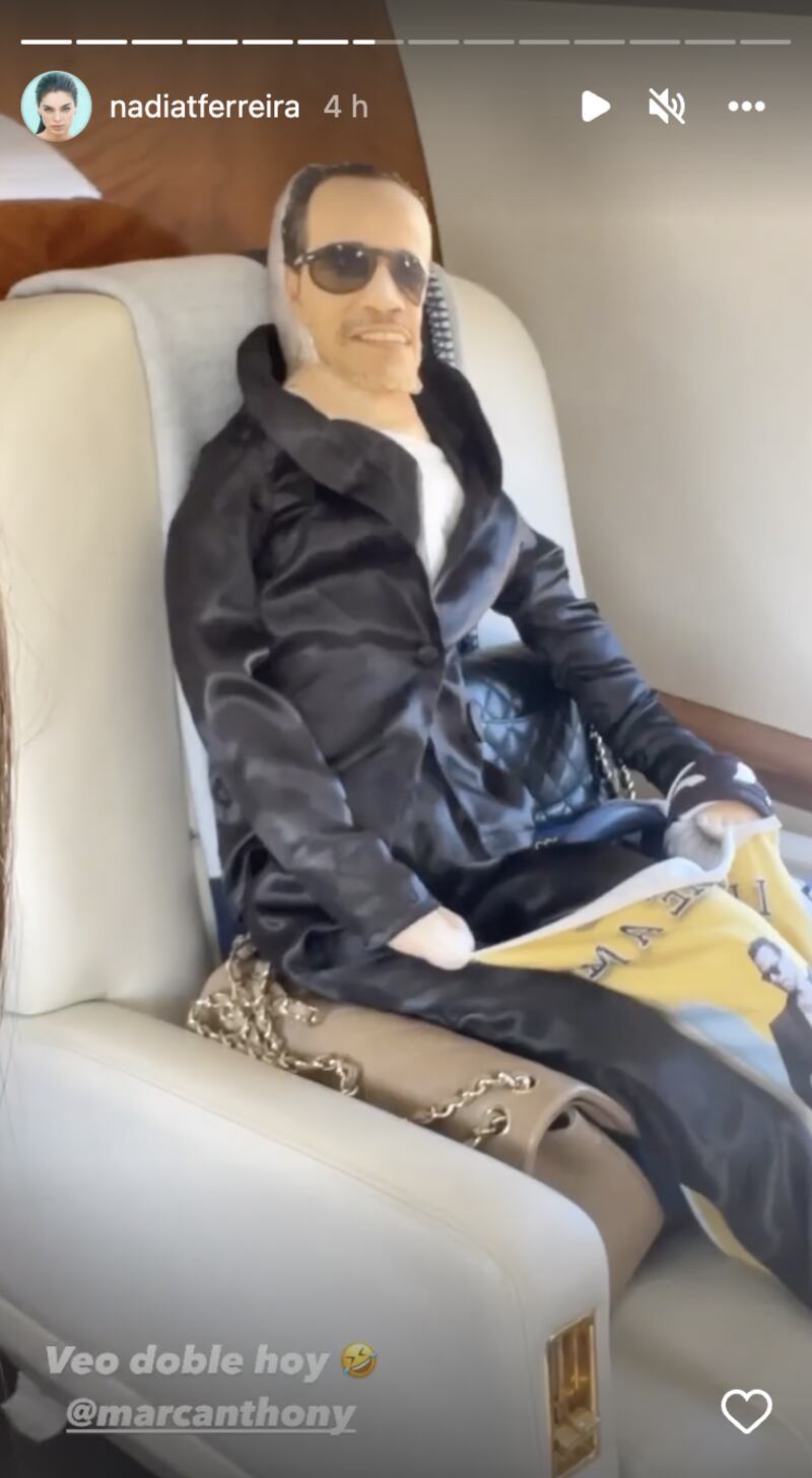 En el pequeño clip, Nadia muestra un muñeco con la cara del cantante de Vivir mi vida de tamaño real sentado en el asiento que está a su lado, posteriormente mostró a su futuro esposo quien también se rió del "acompañante" de Ferreira.