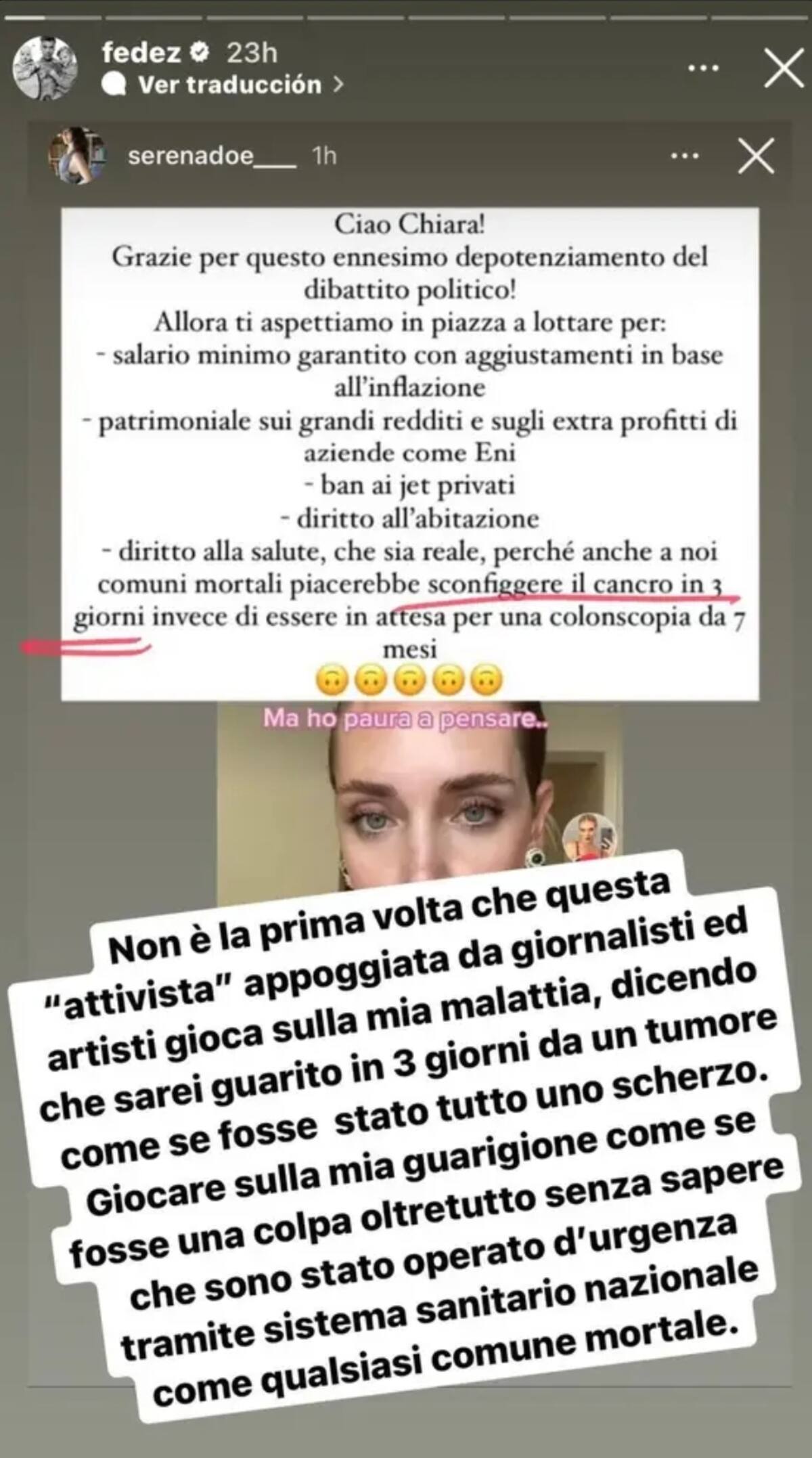 "Hasta los simples mortales nos gustaría vencer el cáncer en tres días en lugar de esperar una colonoscopia durante siete meses", escribió en una historia de Instagram la activista social Serena Mazzini, quien acusó a Fedez (32) de "recuperarse de cáncer en tres días" e irse de vacaciones a Ibiza, España, en lugar de esperar siete meses para hacerse los estudios correspondientes.