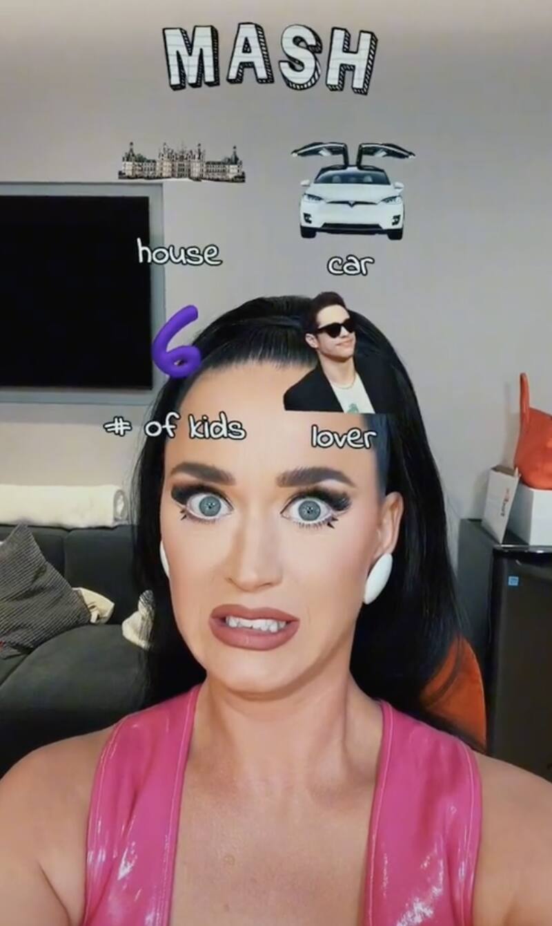 El filtro vaticinó que Perry vivirá en un castillo medieval, que tendrá un Tesla, seis hijos y que su amante será Pete Davidson, quien es pareja de Kim Kardashian.