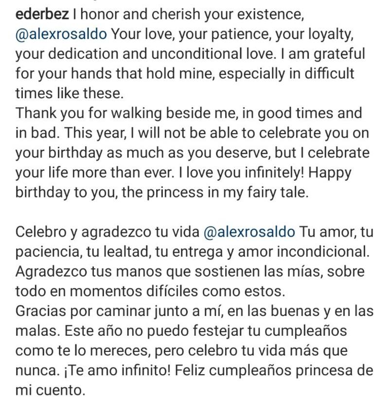 “Celebro y agradezco tu vida @alexrosaldo Tu amor, tu paciencia, tu lealtad, tu entrega y amor incondicional”, escribió Eugenio  quien reconoció el esfuerzo y la dedicación que ha tenido Alessandra en la complicada situación que están pasando por la cirugía de hombro del actor. Cabe mencionar que la también cantante reveló hace unas semanas que “probablemente tendrían que reemplazarle el hombro” a Derbez, lo que ha causado preocupación.