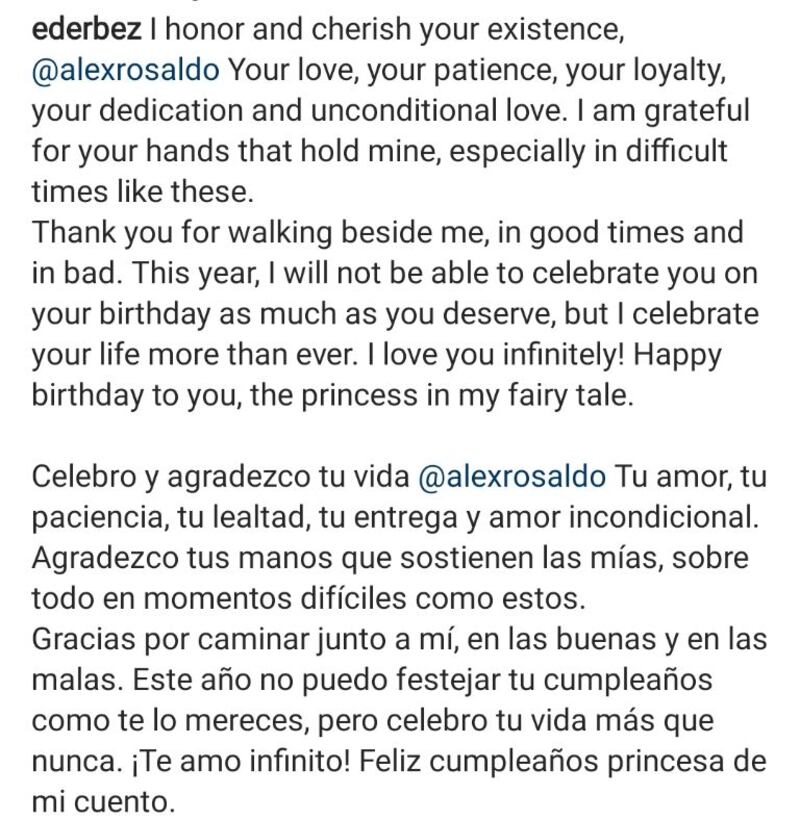 “Celebro y agradezco tu vida @alexrosaldo Tu amor, tu paciencia, tu lealtad, tu entrega y amor incondicional”, escribió Eugenio quien reconoció el esfuerzo y la dedicación que ha tenido Alessandra en la complicada situación que están pasando por la cirugía de hombro del actor. Cabe mencionar que la también cantante reveló hace unas semanas que “probablemente tendrían que reemplazarle el hombro” a Derbez, lo que ha causado preocupación.