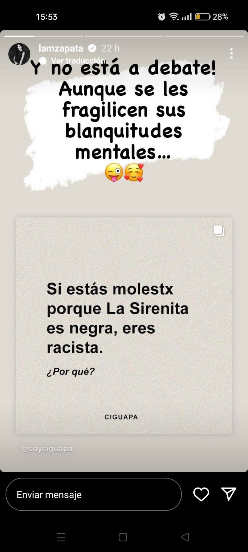 Algunos cibernautas manifiestan que el no aceptar a la actriz solo porque cambiaron la forma en la que se ve, es racista y a esta moción se unión la actriz Maya Zapata (40) quien en su cuenta de Instagram compartió un fuerte mensaje. “Si estás molesto porque La Sirenita es negra, eres racista”, se lee en la imagen que compartió. “Y no está a debate, aunque se les fragilicen sus blanquitudes mentales”, escribió.
