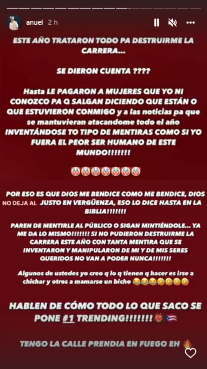 Este año trataron todo para destruirme la carrera”, comenzó escribiendo el famoso cantante puertorriqueño. “Hasta les pagaron a mujeres, que yo no conozco, para que salgan diciendo que están o que estuvieron conmigo, y a las noticias, para que se mantuvieran atacándome todo el año inventándose todo tipo de mentiras como si yo fuera el peor ser humano de este mundo”, explicó Anuel.