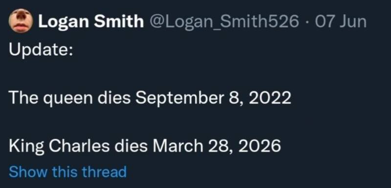 Supuestamente, el rey morirá el 28 de marzo de 2026. “La reina morirá el 8 de septiembre del 2022. El rey Carlos morirá el 28 de marzo de 2026”, escribió Logan Smith el 7 de junio pasado. Por el momento el texto ya no existe, pues fue eliminado cuando comenzó a hacerse viral, y tiempo después la cuenta fue suspendida.