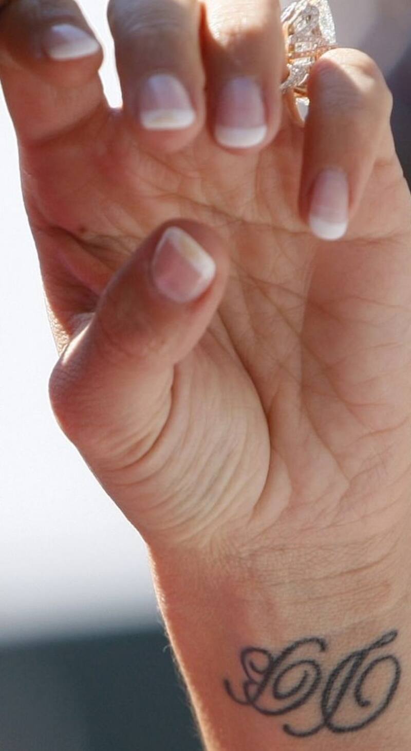 Además de los números romanos VIII-V-MMVI que representan el 8 de mayo de 2006, la fecha en que ella y David renovaron sus votos matrimoniales, su muñeca derecha tenía la frase latina "De Integro", que se traduce como "otra vez desde el principio".