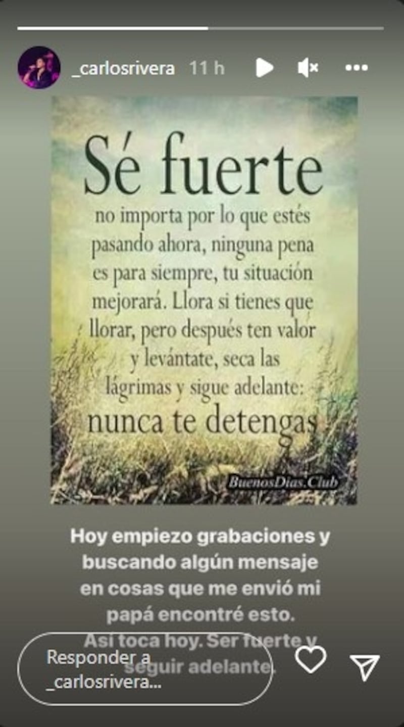 Ahora el intérprete de Te soñé, tomó sus redes sociales para compartir con sus fans uno de los últimos mensajes que le dejó su papá y del cual ha tomado con mucha filosofía: "Hoy empiezo grabaciones y buscando algún mensaje en cosas que me envió mi papá encontré esto. Así toca hoy. Ser fuerte y seguir adelante", escribió el cantante en sus stories.