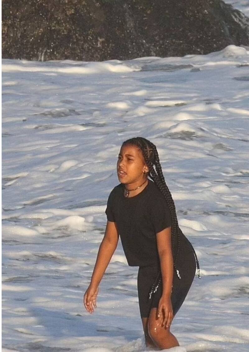 North traía el mismo outfit que la hija de Scott Disick, las dos optaron por un short negro y una playera negra oversize. En las fotos se puede apreciar que la hija de Kim se mete al mar y juega sin la compañía de sus primas quienes prefirieron estar en la arena y correr detrás de Khloé.