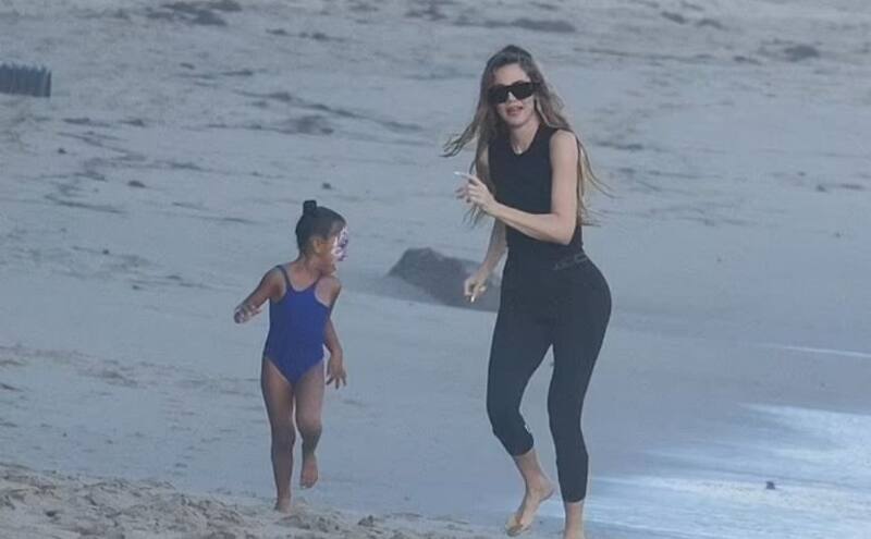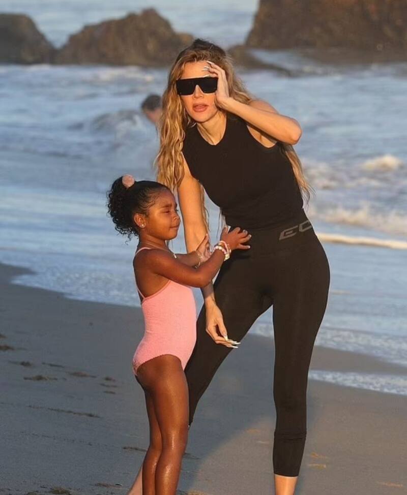 True llevaba puesto un traje de baño rosa, con el cual resaltaba entre sus primas pues fue única que optó por un look colorido, las demás llevaban tonos oscuros. En varias ocasiones la también hija de Tristan Thompson se acercó a su mamá para abrazarla de las piernas mientras ella le acariciaba su cabeza y veían el paisaje.