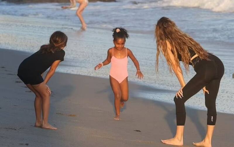 La más pequeña, Chicago, usó un traje de baño azul marino y como ya es costumbre la peinaron con dos chonguitos en cada lado de la cabeza. La modelo estuvo correteando a su sobrina esperando a que las demás se unieran; cabe destacar que en esta ocasión la hija de Kris Jenner seleccionó un pantalón largo y una blusa negra para ir a la playa, olvidándose de sus tradicionales bikinis.