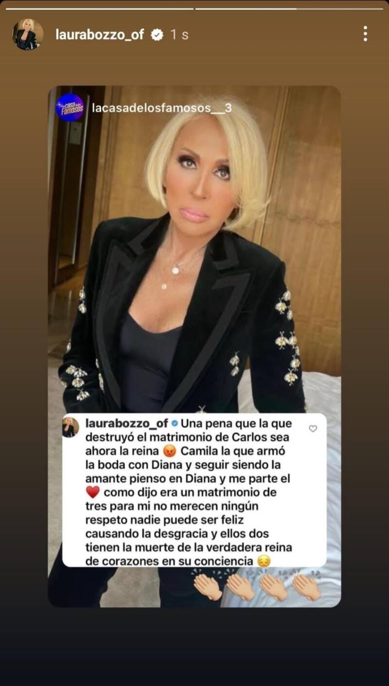 Al parecer, las declaraciones de la princesa Diana son recordadas con rencor por Laura Bozzo, que recurrió a sus redes sociales para mostrar su descontento con la llegada de Camila al trono de Reino Unido. "Para mi no merece ningún respeto, nadie puede ser feliz causando la desgracia y ellos dos tienen la muerte de la verdadera reina de corazones en su conciencia", escribió la presentadora de televisión.