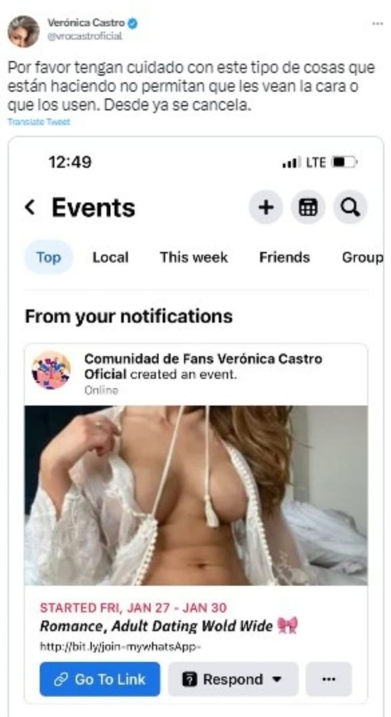 El supuesto evento fue creado por una Comunidad de fans Verónica Castro que se ostentaba como oficial y se veía a una mujer con el pecho al descubierto sin que se le viera el rostro, además de que tal reunión era solo para mayores de edad, por lo que la actriz también pidió que lo reportaran.