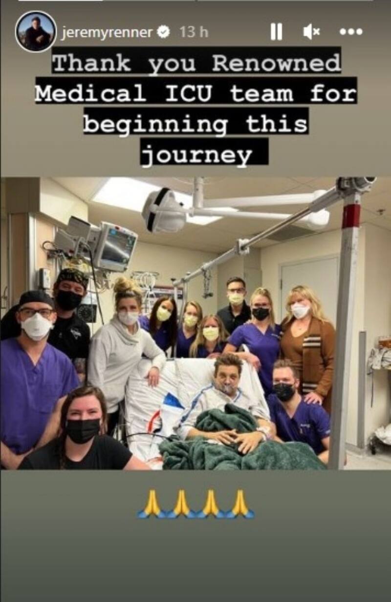 Renner, quien se encuentra con sedación parcial, se mantiene acompañado por su familia directa. Este jueves recibió la visita de su hermana, quien le lavó el cabello, ya que aún no puede levantarse ni menos caminar de manera autónoma. "Un día en la UCI 'no muy bueno' se convirtió en un increíble día de spa con mi hermana y mi mamá. Muchas gracias", escribió en su cuenta de Instagram.