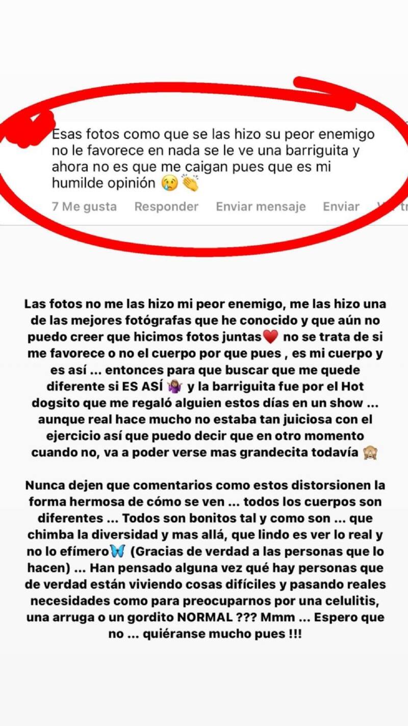 “¿Han pensado alguna vez que hay personas que de verdad están viviendo cosas difíciles y pasando reales necesidades como para preocuparnos por una celulitis, una arruga o un gordito normal? Mmm … espero que no. Quiéranse mucho pues”, cerró la cantante, que agradeció los buenos comentarios e hizo un llamado a apreciar la diversidad de cuerpos y “ver lo real y no lo efímero”.