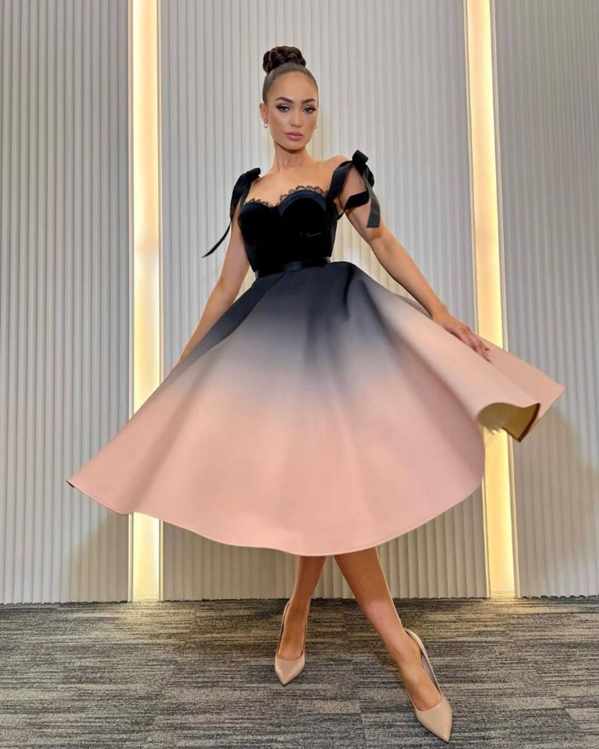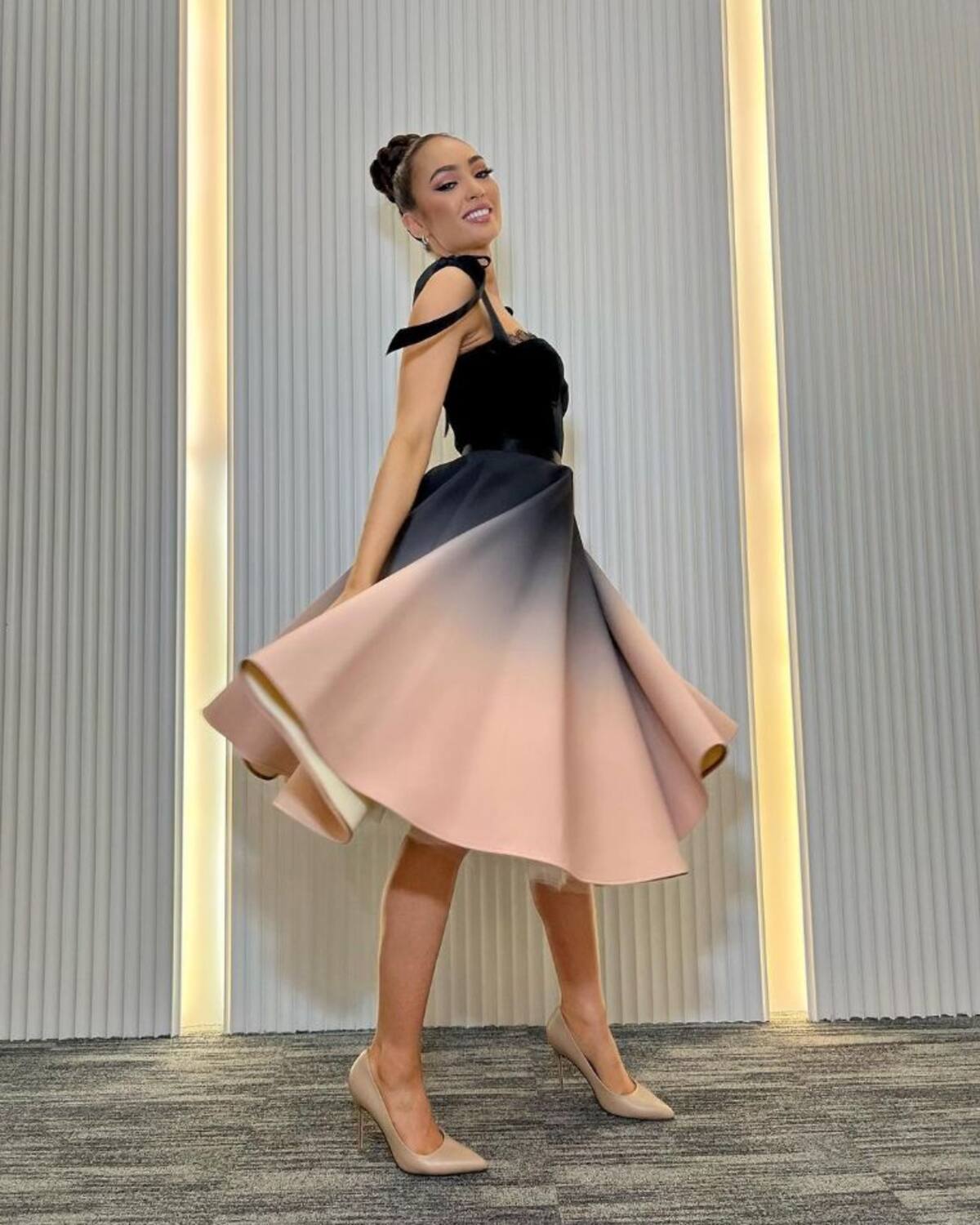La joven estadounidense lució un vestido de estilo bailarina de ballet que ella misma comparó con los sofisticados looks que aparecen en la conocida serie de Netflix protagonizada Lily Collins. El diseño tenía una tela que comenzaba con completo negro en la parte superior y terminaba, por medio de un degradado, en un pálido color rosa. Complementó el vestido con zapatos en tono nude, el cabello recogido y un maquillaje sencillo.
