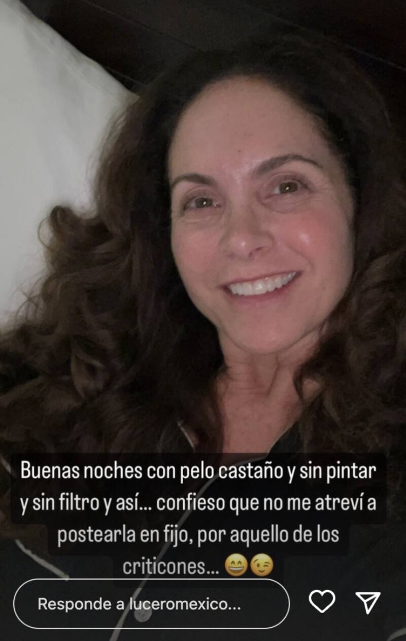 “Buenas noches con pelo castaño y sin pintar y sin filtro y así….confieso que no me atreví a postearla en fijo por aquello de los criticones”, escribió la ex esposa de Manuel Mijares junto a unos emoticones riendo y guiñando un ojo.