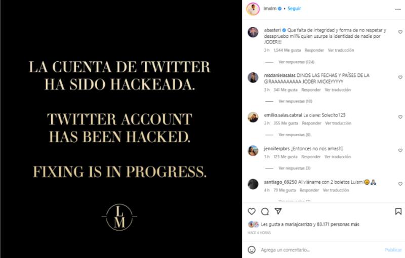 “La cuenta de Twitter ha sido hackeada. La recuperación está en progreso”, se lee en el breve anuncio que se difundió a través de Instagram, sin ofrecer más detalles sobre el tema. El incidente provocó diversos comentarios entre los fanáticos y personas cercanas al intérprete, incluyendo a su hermano, Alejandro Basteri (50).