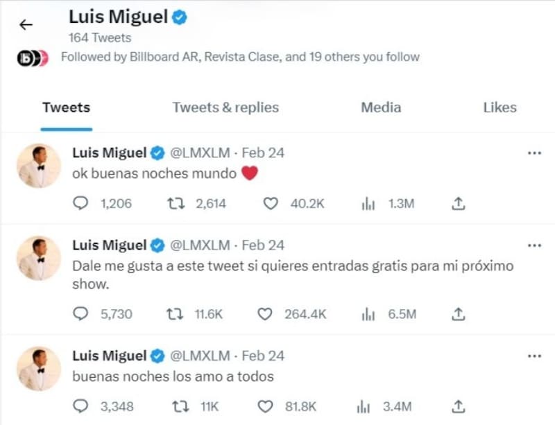 Desde hace dos días los seguidores de Luis Miguel se sorprendieron cuando en su cuenta de Twitter comenzaron a circular amorosos mensajes y promesas de boletos gratis para su próxima gira, Luis Miguel Tour 2023. Dichas publicaciones resultaron misteriosas para los fans del cantante, pues el famoso se ha caracterizado por ser muy hermético y mantenerse alejado de las redes sociales.