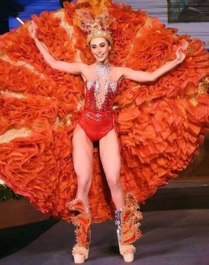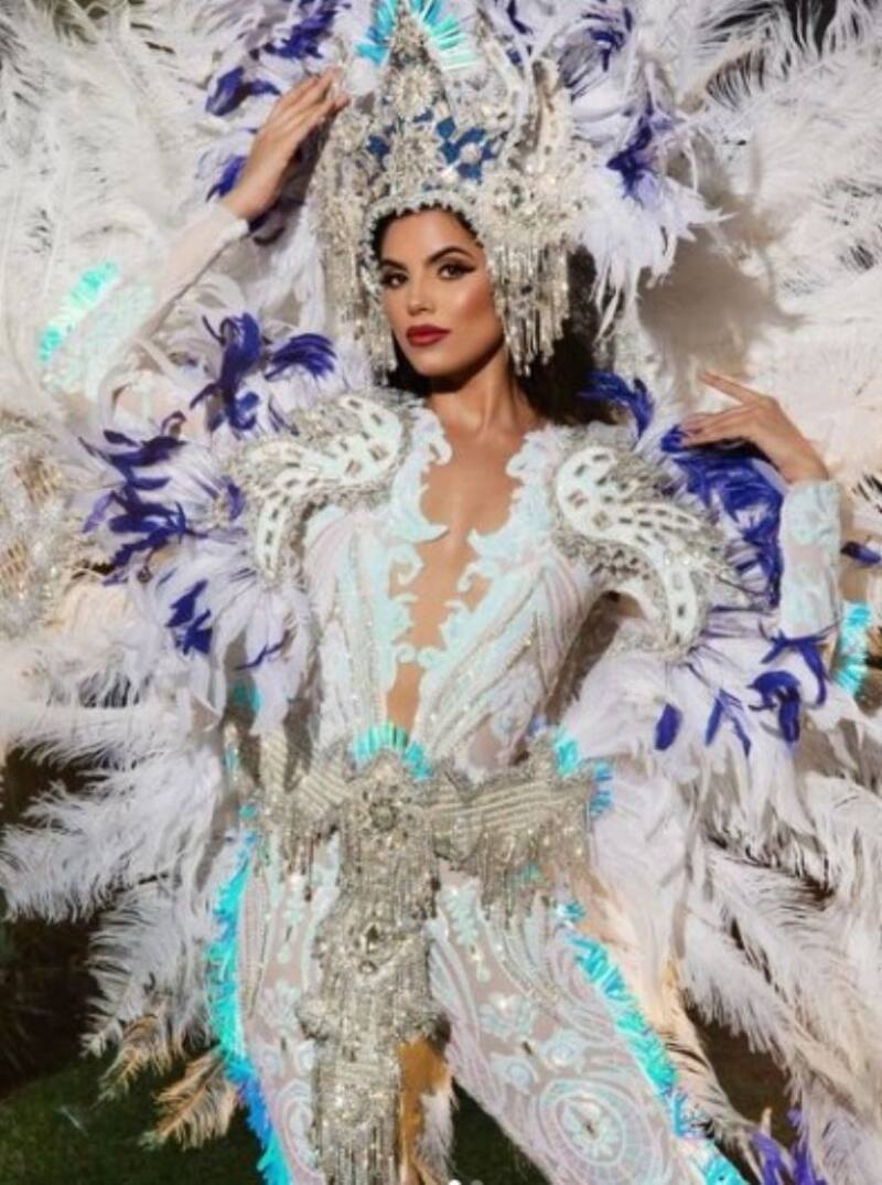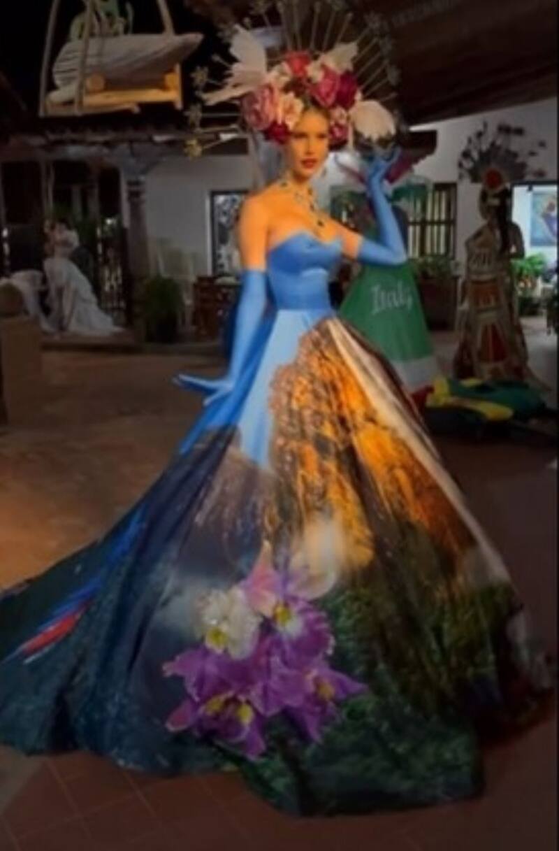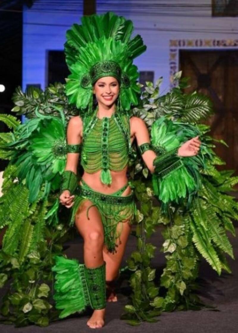 La voluptuosa reina brasileña Guilhermina Montarroyos exhibió un espectacular traje típico que homenajeó a los pueblos indígenas de Brasil. "Alude a la mezcla de razas, tan característica de nuestra gente. Protege a los pueblos originarios! En nuestra bandera, el verde representa la esperanza, nuestros bosques y selvas, y es exaltando este color que anhelamos días mejores para nuestro planeta", señaló Guilhermina.
