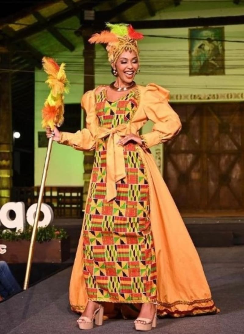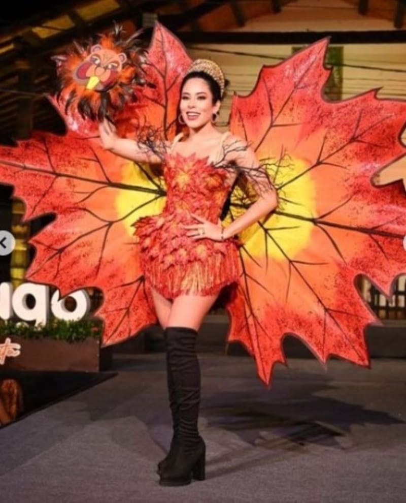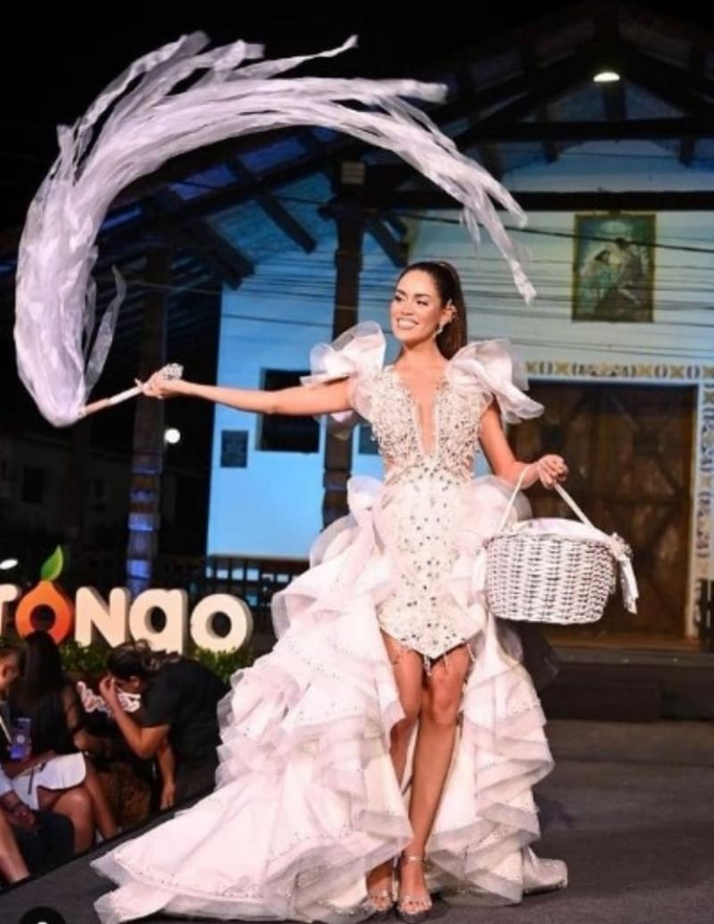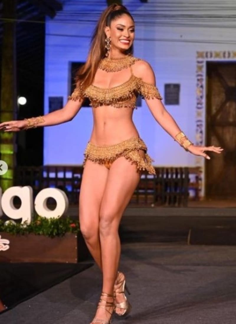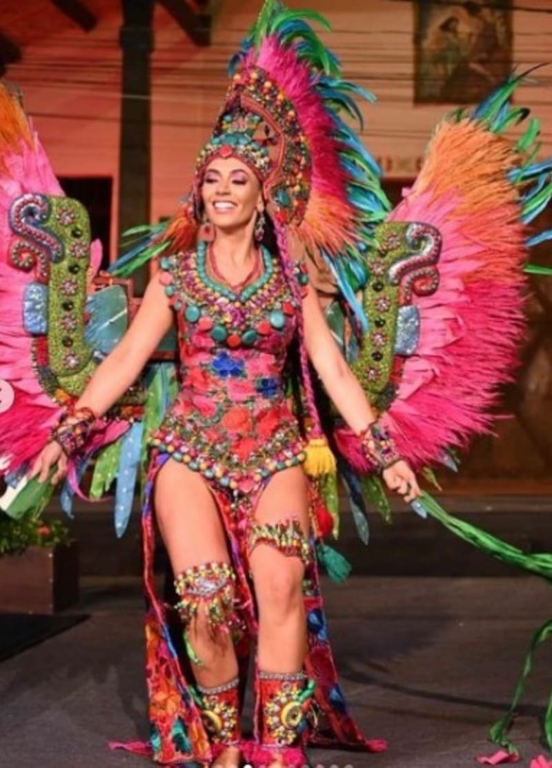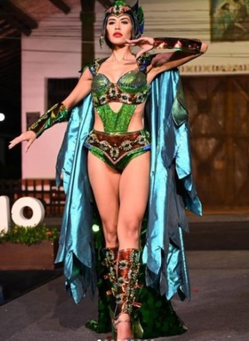 La voluptuosa reina brasileña Guilhermina Montarroyos exhibió un espectacular traje típico que homenajeó a los pueblos indígenas de Brasil. "Alude a la mezcla de razas, tan característica de nuestra gente. Protege a los pueblos originarios! En nuestra bandera, el verde representa la esperanza, nuestros bosques y selvas, y es exaltando este color que anhelamos días mejores para nuestro planeta", señaló Guilhermina.
