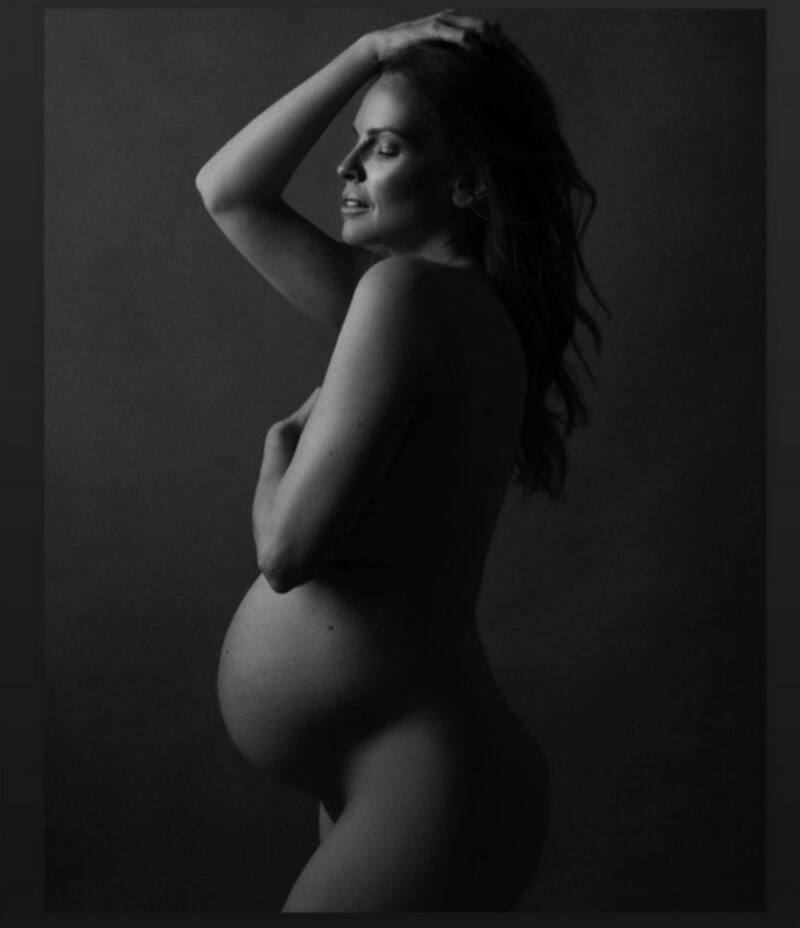 "Estaba de 27 semanas y media", señaló la actriz quien se ve en las fotos en blanco y negro sin ninguna prenda y sólo cubriéndose con las manos, además el fotógrafo también compartió una imagen de la sesión en la que posó con el brazo sobre la cabeza.