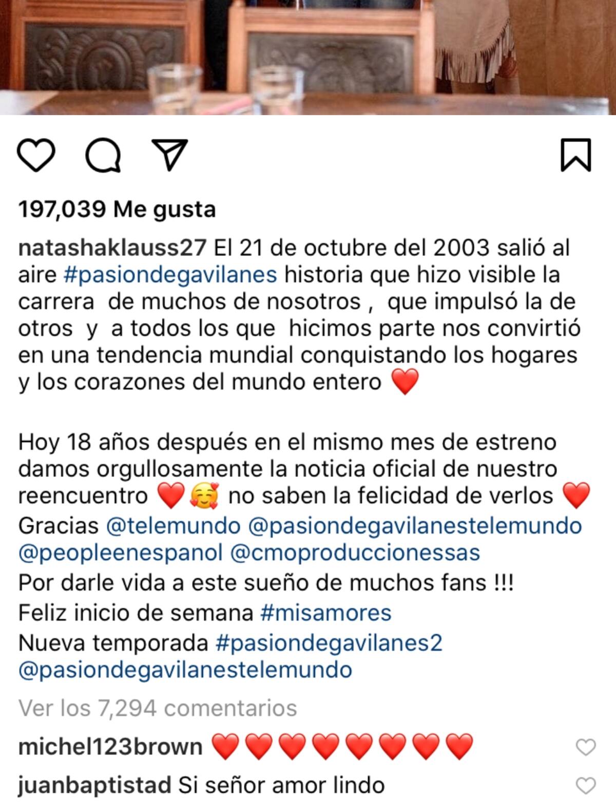 Natasha Klauss también dio a conocer la noticia a través de su Instagram con un mensaje en el cual mostró su entusiasmo por regresar a esta historia, con un mensaje al cual reaccionó el actor.