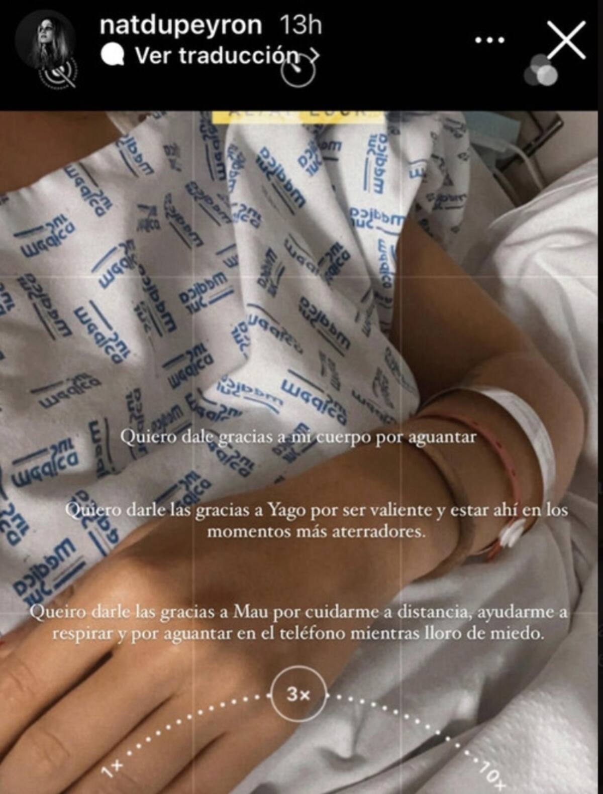 "Quiero darle gracias a mi cuerpo por aguantar; quiero darle las gracias a Yago (su esposo) por ser valiente en los momentos más aterradores; quiero darle las gracias a Mau (su amigo) por cuidarme a distancia, ayudarme a respirar y por aguantar en el teléfono mientras lloro de miedo".