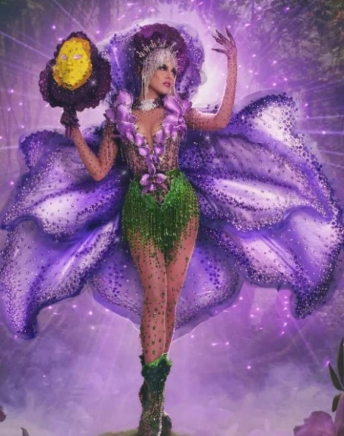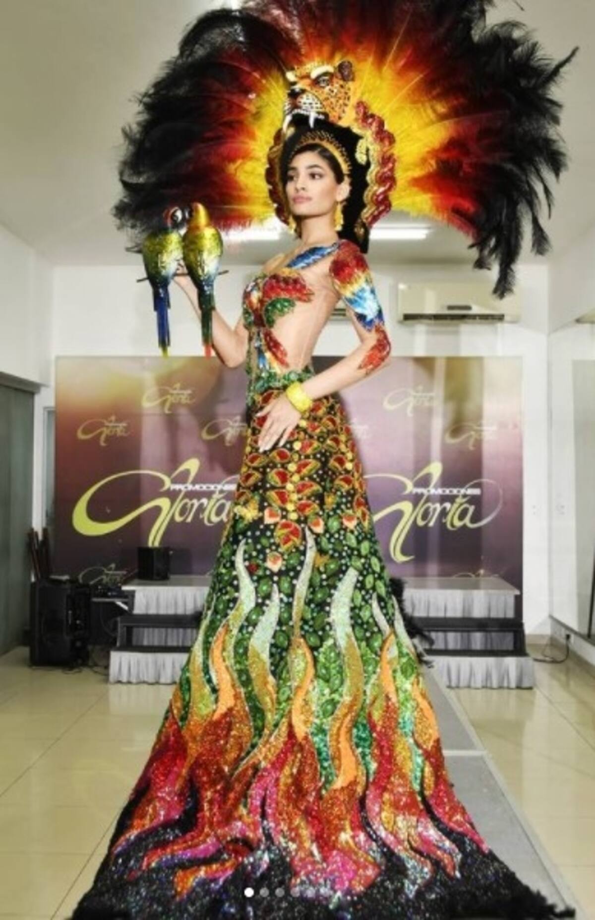 El atuendo se inspiró en la Orinoco Superba, una variedad de la orquídea que crece en las cuencas del río Orinoco y que se caracteriza por su color lila, el púrpura oscuro de sus lóbulos y el amarillo del centro del labelo que tiene líneas fucsias.