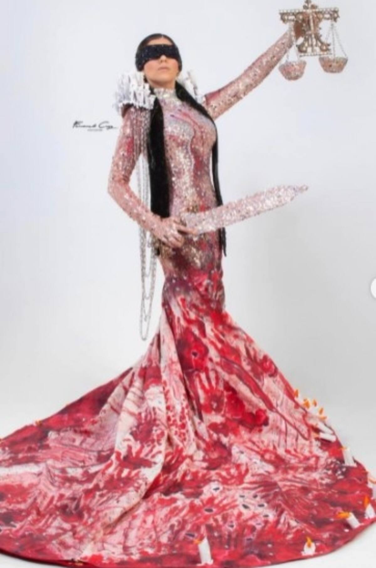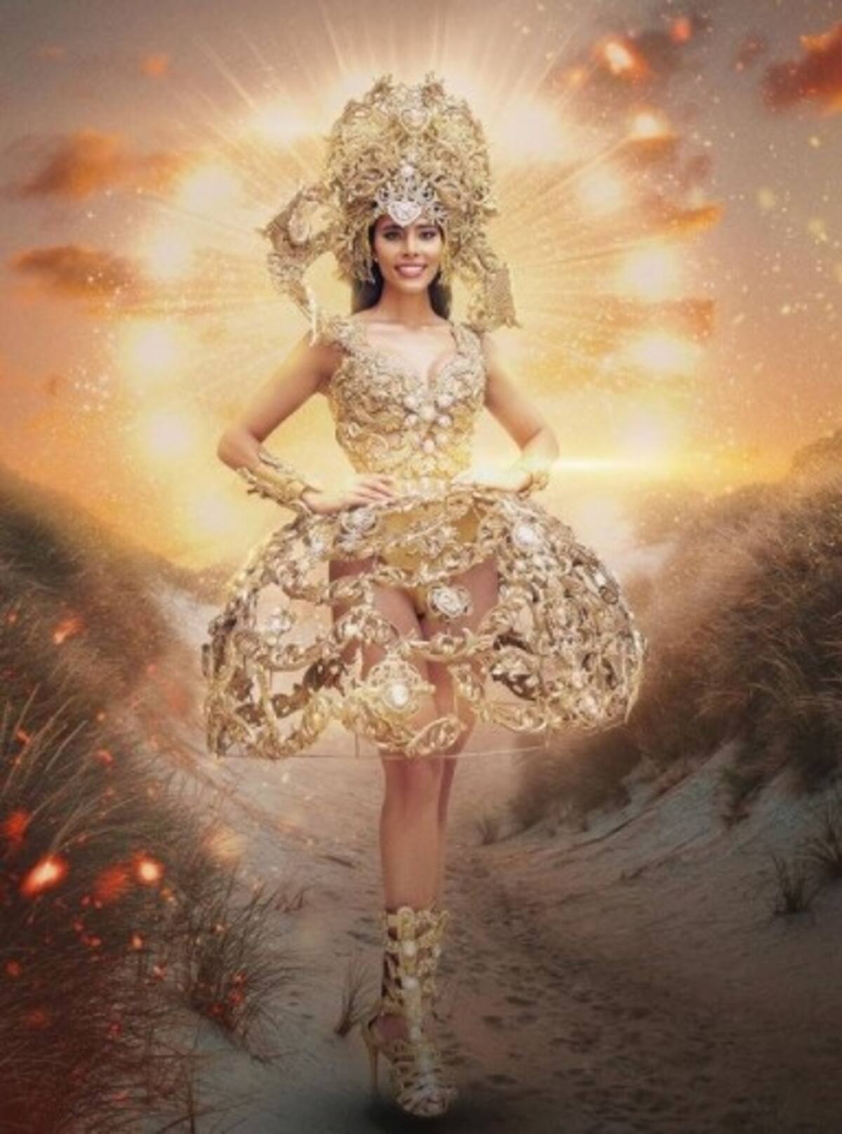 Emuló a "La diosa del Sol", inspirándose en el paisaje de Las Dunas de Baní, tesoro nacional caracterizado por sus altas montañas de fina arena blanca.