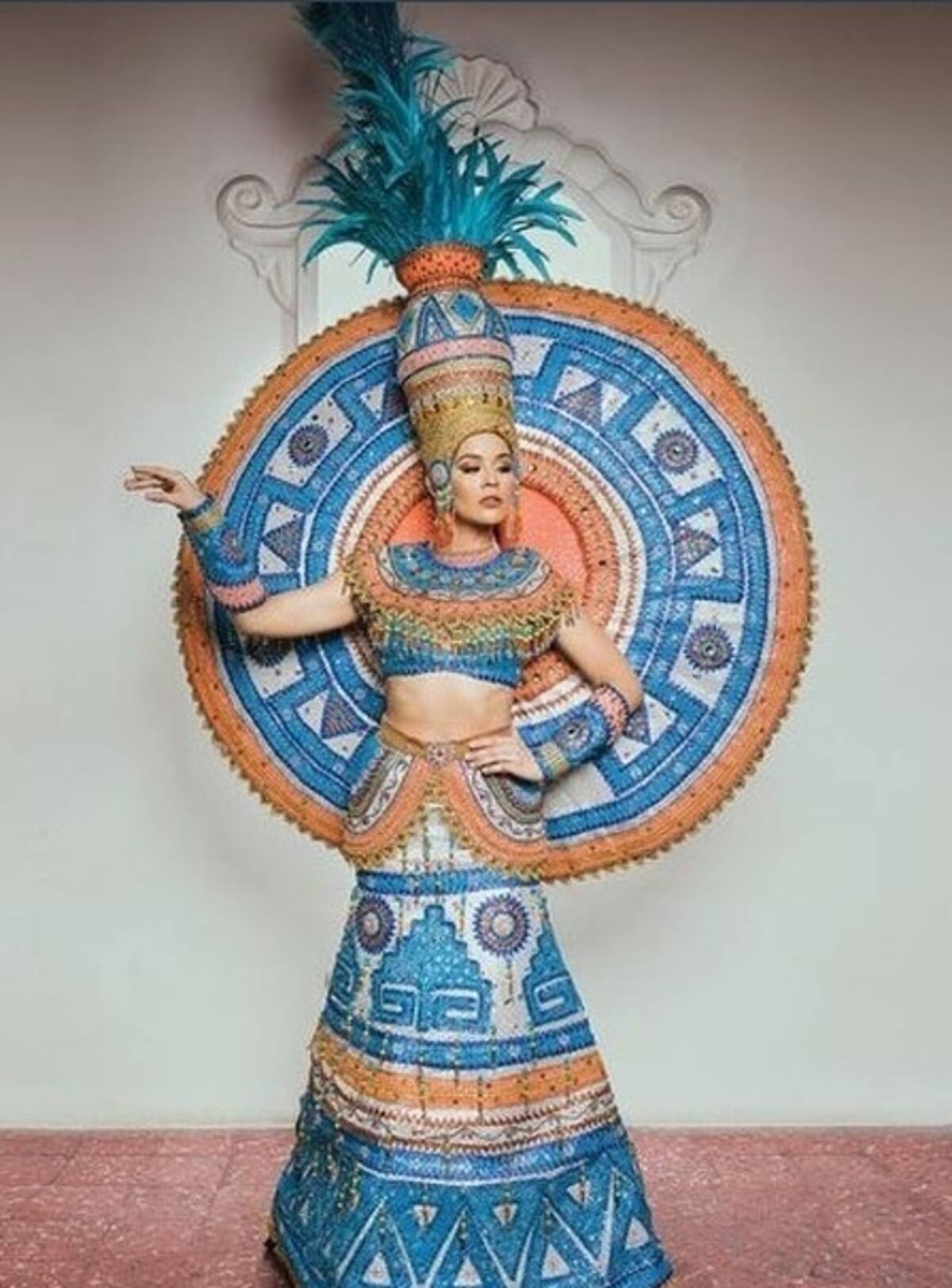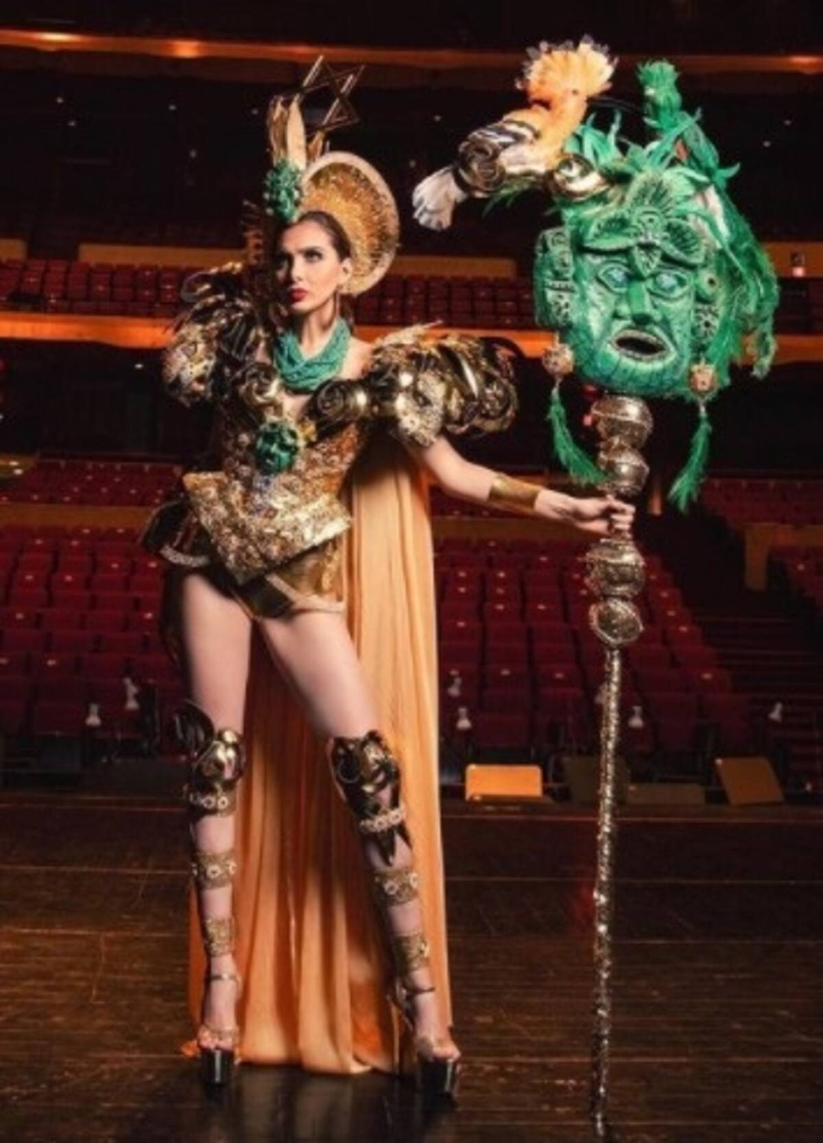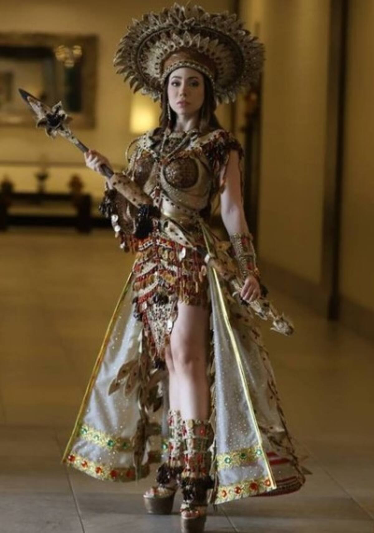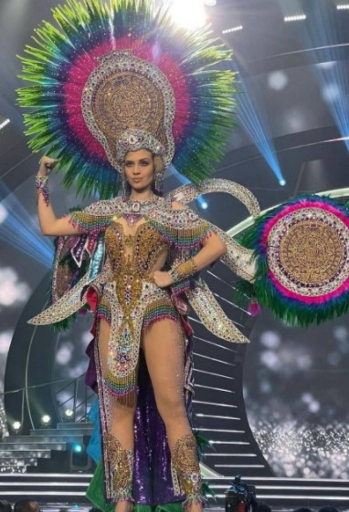 Traje típico inspirado en la cultura azteca. El vestido tiene más de un millón de cristales incrustados resaltando el emblemático calendario azteca.