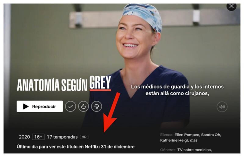 "Último día para ver este título en Netflix: 31 de diciembre", se lee en la descripción de Grey's Anatomy en la organización de streaming.
