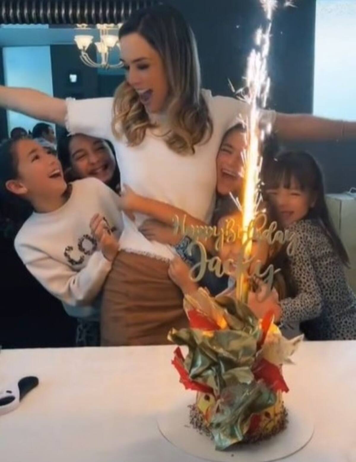 En la imagen aparece con sus cinco hijas -Jacqueline, Carolina, Renata y las mellizas Paula y Emilia- y rápidamente recibió saludos de participantes del concurso "Así se Baila", que condujo esta temporada, entre los cuales se cuentan Luna Pernía, Adrián Di Monte, Sandra Itzel, entre otras celebridades. Jacky también se dio tiempo para hacer un video para Tik Tok, que justamente cerró con el abrazo de sus pequeñas.