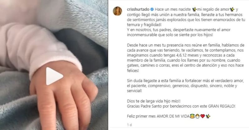 La ex presentadora de Guerreros publicó un tierno video con un emocionante mensaje en su cuenta de Instagram, donde dice que "hace un mes naciste mi regalo de amor y contigo llegó más unión a nuestra familia, llenaste a tus hermanos de sentimientos jamás explorados que los tienen enamorados de tu ternura y fragilidad. Y en nosotros, tus padres, despertaste nuevamente el amor inconmensurable que solo se siente por los hijos".