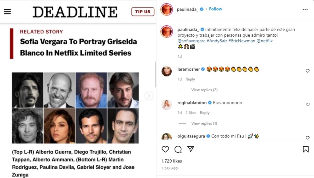 La actriz colombiana Paulina Dávila no cabe de la emoción por su próximo proyecto:Griselda. la nueva serie de Netflix; Su felicidad por esta producción de Sofía Vergara la ha compartido con sus seguidores a través de su cuenta de Instagram, en la cual, como muchos famosos, siempre anuncia los proyectos que tiene en puerta como una forma de agradecimiento a quienes siguen de cerca su carrera.