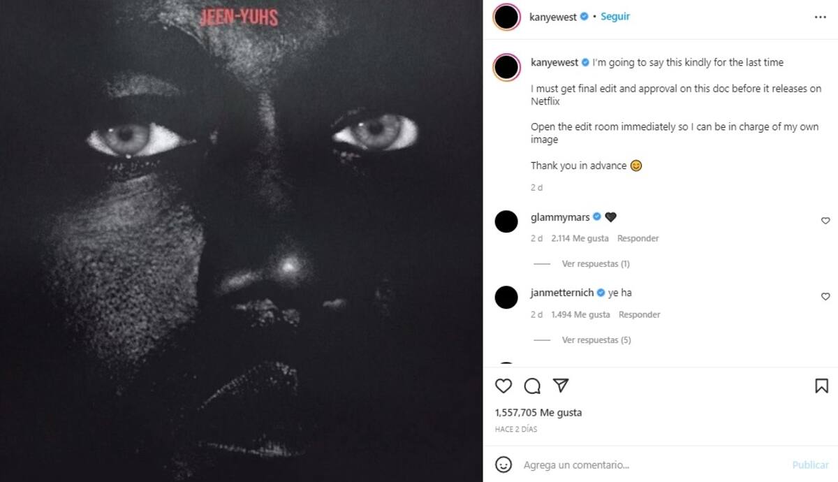 West escribió el viernes en Instagram que "deben obtener la edición final y la aprobación de este documento antes de su lanzamiento en Netflix", donde está previsto el lanzamiento masivo el próximo 16 de febrero.