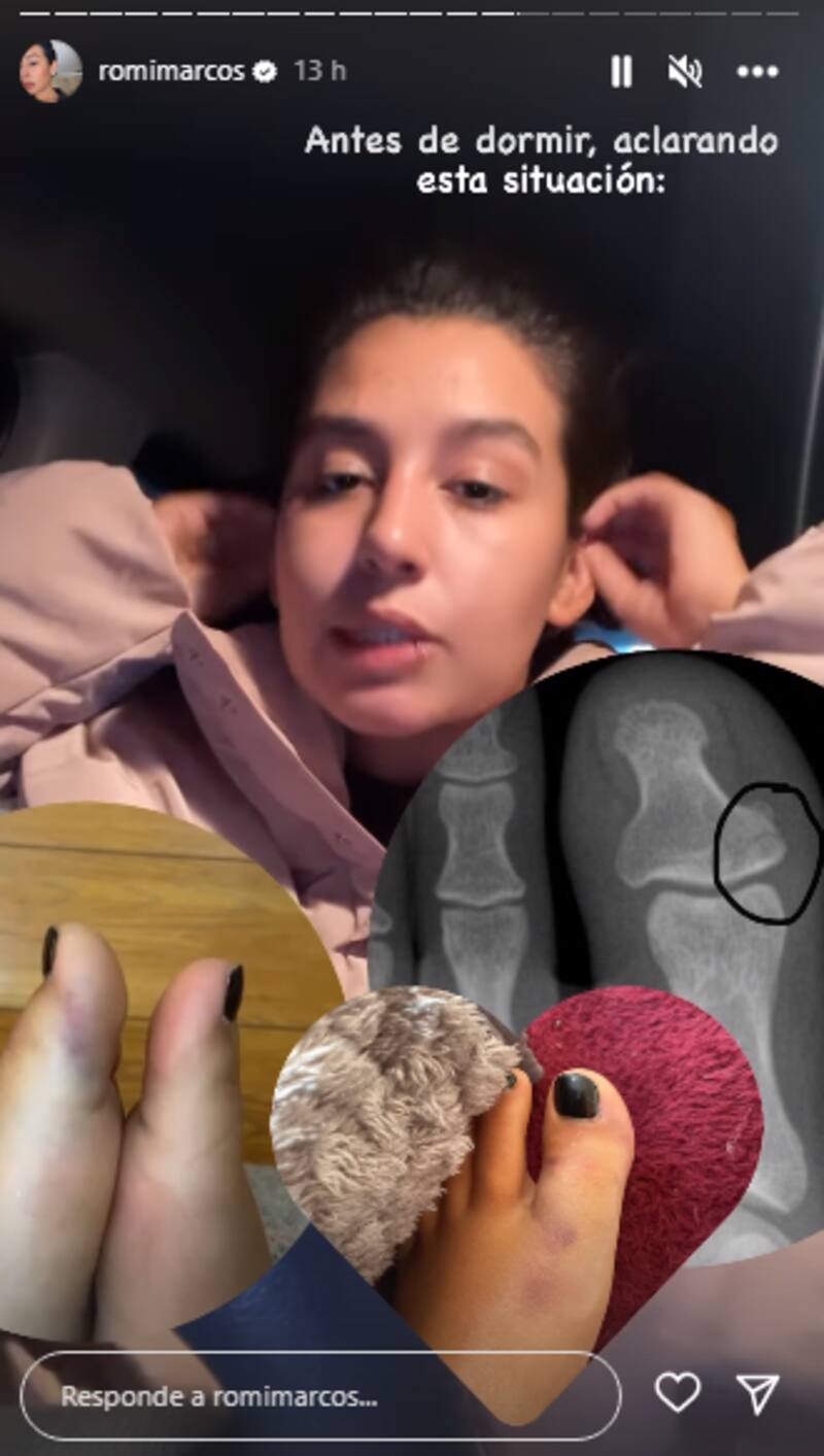 "Para que no quede duda de que me fisuré el dedo, dejó aquí evidencia. Ahí les presumo mi dedito gordo del pie izquierdo, morado, inflamado, la fisura, porque yo no sé si ustedes creen que yo estoy muy feliz con una bota en el pie, están muy equivocados. Ustedes están diciendo, que padre, Romina lo está haciendo para llamar la atención, pues no", detalló Marcos en sus redes sociales.