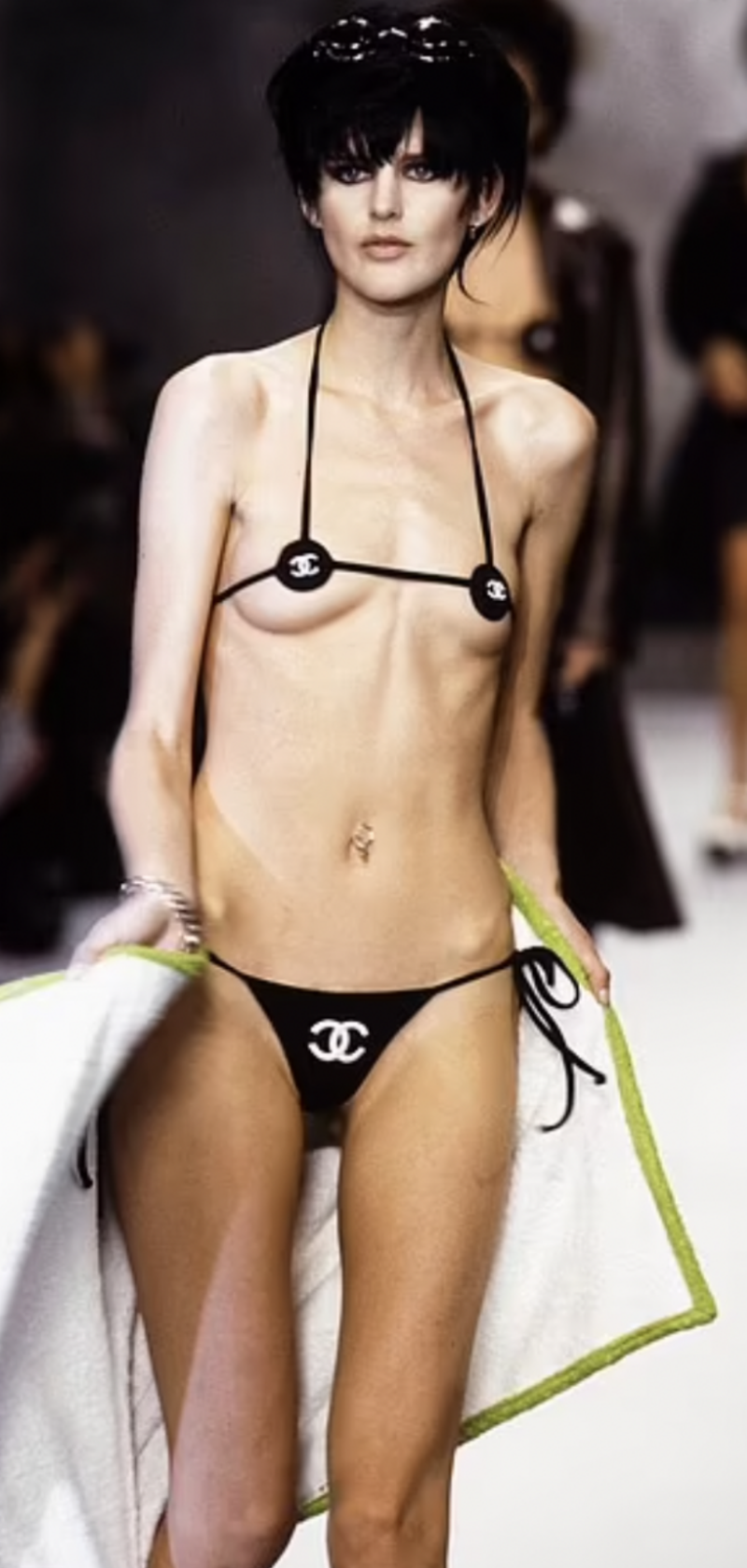 Antes de Kim Kardashian, fueron las modelos Stella Tenant y Carla Bruni quienes mostraron el traje en la pasarela de 1995 durante el show de Chanel en París.