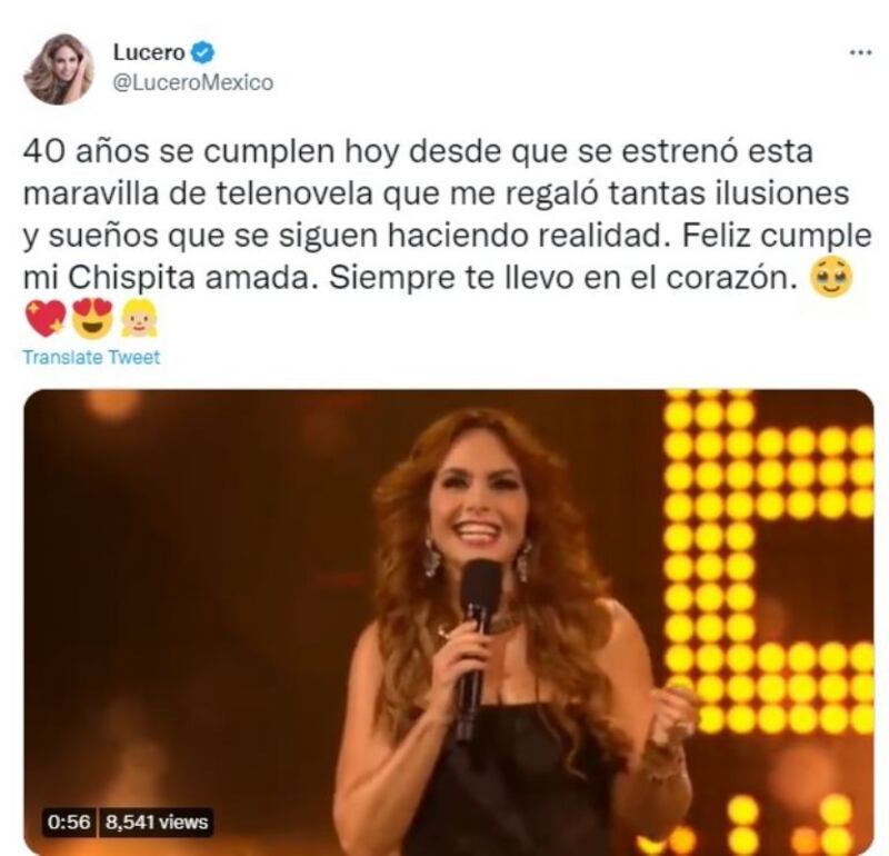 “Ahhh mi CHISPITA todos la llevamos en el corazón”, “Como 40 años, el personaje que te hizo soñar y desde ese día, hasta hoy, sigues cumpliendo tus sueños, siempre dispuesta a hacerlos realidad”, fueron algunos de los mensajes que recibió por el aniversario del melodrama.