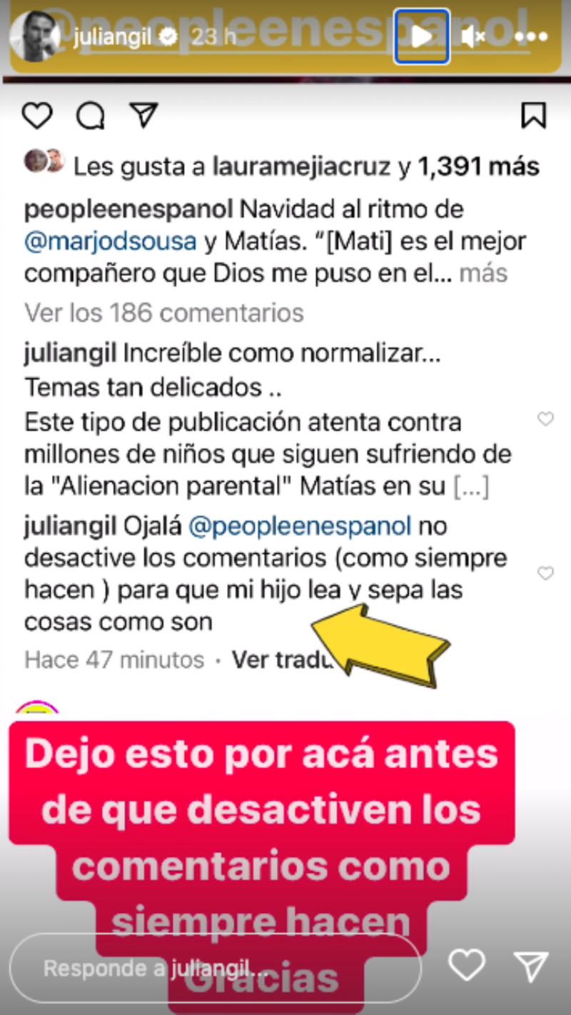 Es importante destacar, que la hija mayor de Julián Gil, Nicole (35) también reprochó la actitud que tomó durante el reportaje “Una Navidad más donde no conocemos o compartimos con Matías. Marjorie te recomiendo que no tomes el nombre de Dios en vano. El que menciona el nombre de Dios debería hacerlo siendo consciente de la responsabilidad que esto implica. Aplícalo en tu vida y la de Matías, recuerda que no solo tiene una mamá, también tiene un padre, hermanos, tíos y primos”, escribió la joven.