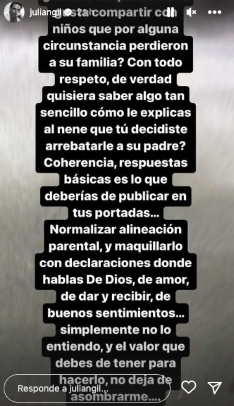 "Coherencia, respuestas básicas es lo que deberías de publicar en tus portadas. Normalizar alienación parental y maquillarlo con declaraciones donde hablas de Dios, de amor, de dar y recibir, de buenos sentimientos. Simplemente no lo entiendo y el valor que debes de tener para hacerlo no deja de asombrarme", arremetió en su cuenta de Instagram.
